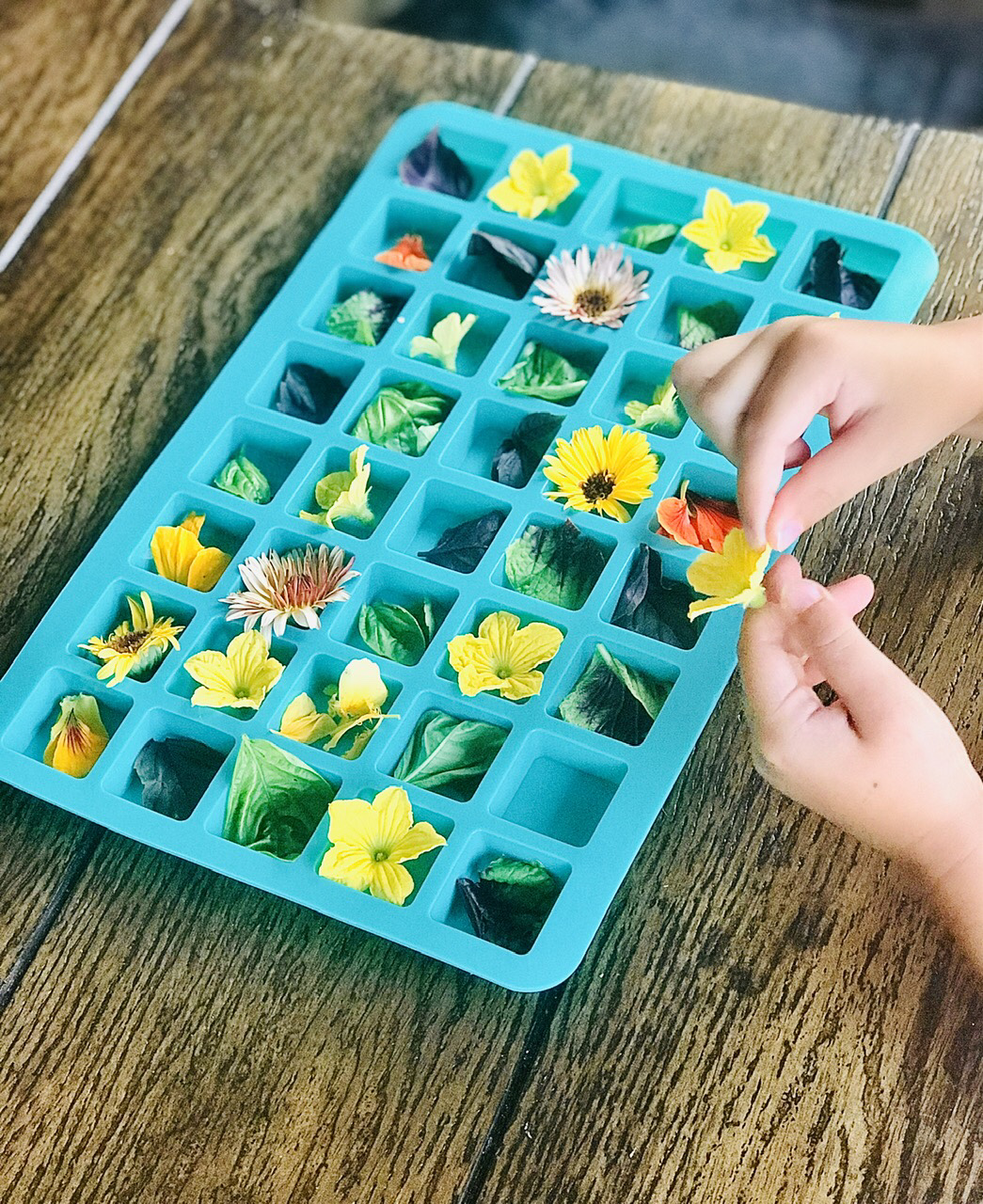 Simply harvest what you need and place your herbs and/or flowers in an ice cube tray. Using a pitcher, pour water into each divot. Place in your freezer and leave uninterrupted for 4 hours.