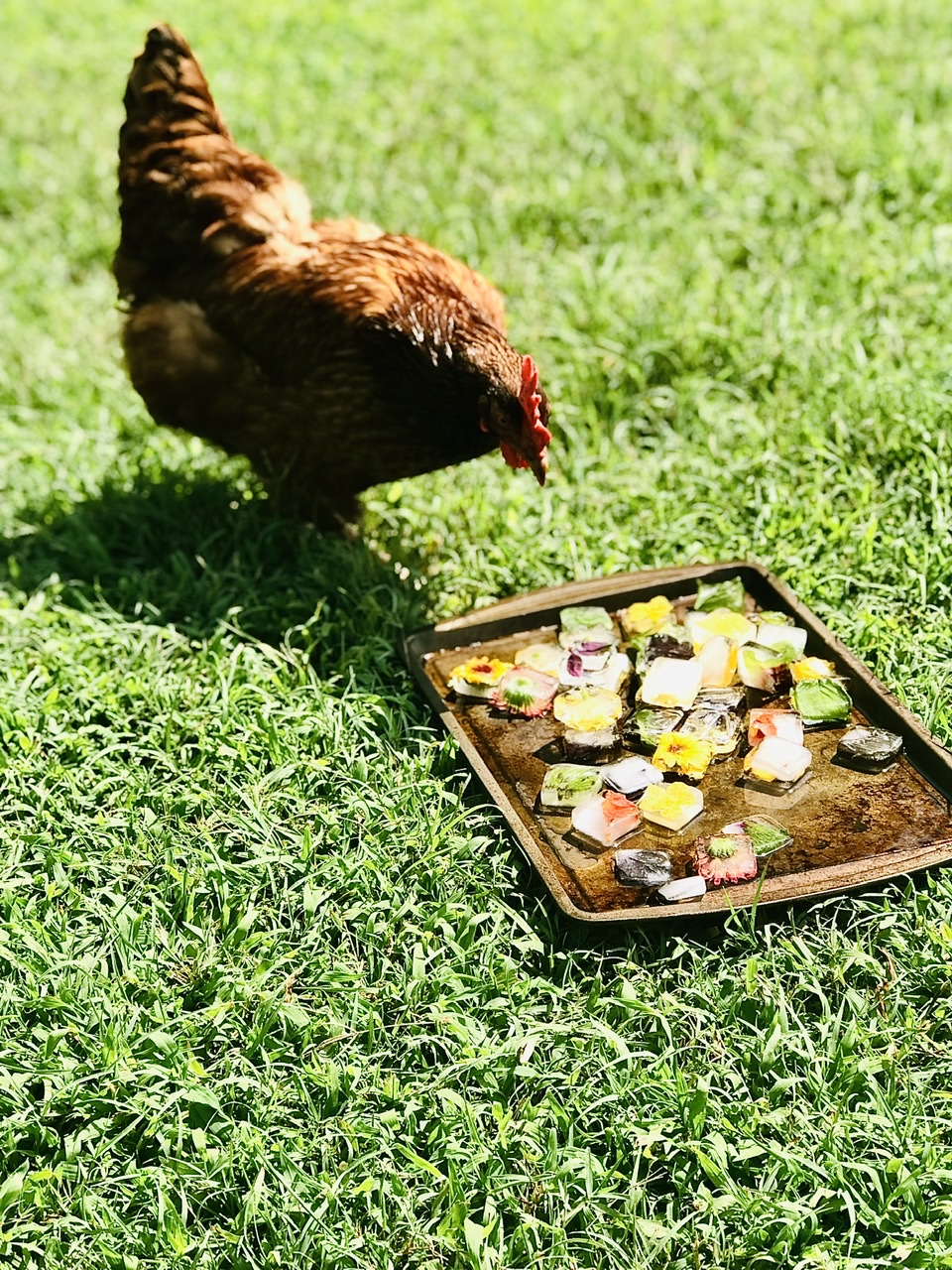 This honestly doesn’t even have to be for chickens. You can take different edible flowers, fruits, and herbs to make ice cubes for your own drinks. Basil ice cubes are extremely refreshing in drinks, like lemonade.